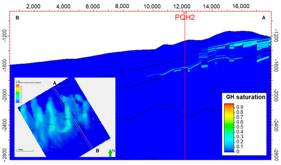 Gas hydrates occur in places where the surrounding temperature is low and the pressure is high. A close examination of the PQH2 prospect, predicted by both the low and intermediate models (Figure 16), shows that PQH2 has a relatively lower temperature than the surrounding environment. This lower temperature can be attributed to many geological factors. One possible reason is the high thermal conductivity of the overlaying sedimentary layers or the reservoir layer itself. In this case, the thermal isocline of the prospect area bends downward, and the temperature is lower than the surrounding condition. This is one of the main reasons that methane hydrate accumulates in the PQH2 prospect.
