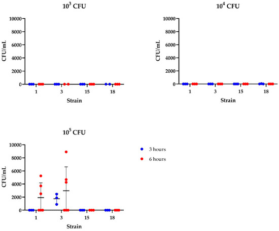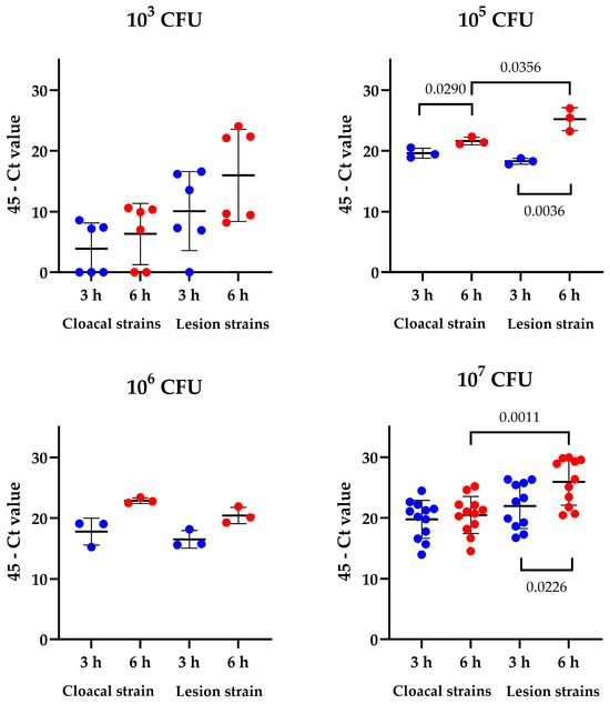 Significant differences between cloacal and lesion strains were detected after inoculation with 105 but not with 106 CFU, although the bacterial DNA levels at 6 h were consistently higher compared to 3 h after inoculation. At the highest dose of 107 CFU, a significant difference was detected between cloacal and lesions strains and, for the lesion strains, there was also a significant effect of time. Strain specific data are given in Table 2.