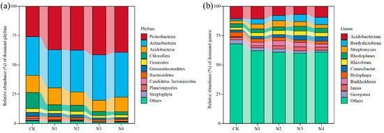 At the phylum level, the dominant bacterial phyla consisted of Proteobacteria, Actinobacteria, Acidobacteria, Chloroflexi, Firmicutes, and Gemmatimonadetes (Figure 2a). Although the dominant phyla of the bacteria in all soils were consistent, changes in the relative abundance of the dominant taxa were observed across different treatments (Figure S3). There was a higher abundance of Proteobacteria and a lower abundance of Chloroflexi, Firmicutes, and Gemmatimonadetes in N addition treatments compared to CK (p < 0.05) (Figure S3).