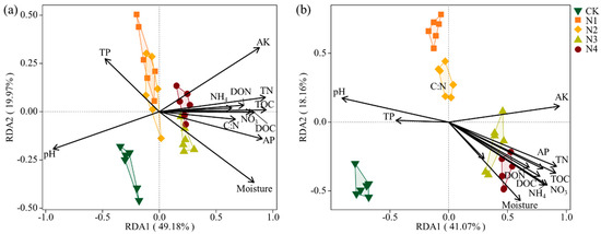 Nitrogen deposition can alter a variety of soil properties, affecting microbial community composition by regulating soil N availability and pH [50]. This may directly or indirectly affect the soil microbial community [50]. In this study, the relative abundance of Proteobacteria and Actinobacteria was significantly negatively correlated with pH (Figure S6). Meanwhile, PCoA based on OTU levels confirmed changes in community composition between the N addition treatments (Figure 3). The first PCoA component separated communities into three clusters based on N addition rates. N1 and N2 treatments clustered together, N3 and N4 treatments clustered together, and the two groups both separated from CK (Figure 3). These results confirm that nitrogen addition has a significant effect on the community structure of soil bacteria [19,51]; 4 g N m−2 yr−1 may be a threshold for changes in the composition of soil bacterial communities in lava plateaus (Figure 4, Figure 5 and Figure S8). The redundancy analyses (RDA) further illustrated that nitrogen addition significantly changed the bacterial community structure at both the phylum level and genus level (Figure 3). Bacterial community composition was found to be significantly correlated with TN, NO3—N, NH4+-N, and DON. Our result is consistent with those of Yan et al. [79] and Fierer et al. [80], who showed that the shift in dominant life history strategies could be a result of the increase in N availability. Soil total nitrogen has a significant influence on microbial community structures [81]. Soil organic carbon was also reported to be the most important factor influencing the bacterial community [82]. Soil pH was reported to decrease with N addition [79,83], and decreased pH led to a change in soil bacterial community [84].