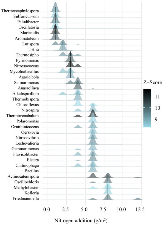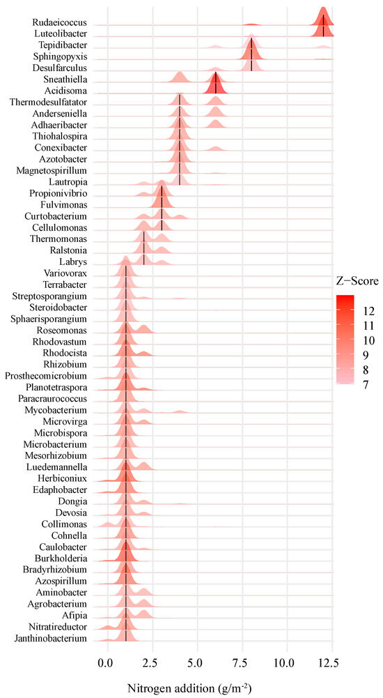 The taxonomy analysis of the threshold indicators (TITAN) showed that the relative abundance of the genera increased with the amount of nitrogen addition. In the figure, the positions of the black short lines in the red peak patterns are the change points observed by the index taxa of the screening criteria. The red peak patterns intersecting the black short lines are the 5th and 95th quantiles of the bootstrap distribution of the change points for each taxon, i.e., confidence or variability bands such as those illustrated in Figure 5. In the figure, the color depth of the peak pattern is proportional to the indicator z value, so darker peak patterns are taxa with stronger relative responses to the nitrogen gradient.