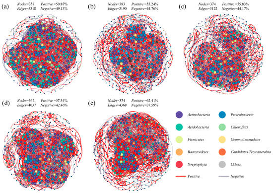 To examine the relationship and interactions between different microbial species, co-occurrence networks based on Spearman’s rank were performed using abundance data of OTU levels of bacterial communities. The co-occurrence patterns were explored based on strong (Spearman’s correlations >|0.9|) and significant correlations (p < 0.01). p-values were adjusted for multiple testing using the false discovery rate (FDR) according to Benjamini controlling procedure [47]. Gephi (version 0.9.2, http://gephi.org/, accessed on 1 January 2024) was used to visualize network graphs with a Fruchterman–Reingold layout. To further describe the topological properties of networks, several indicators, including the number of nodes and edges, average degree, path length, diameter, clustering coefficient, density, and modularity, were computed using the ‘igraph’ package in R. The correlation network was visualized using Gephi software. Based on within-module connectivity (Zi) and among-module connectivity (Pi), nodes were categorized into four types: (1) network hubs (highly connected within the entire network, Zi > 2.5, Pi > 0.62); (2) module hubs (highly connected within a module, Zi > 2.5, Pi < 0.62); (3) connectors (link modules, Zi < 2.5, Pi > 0.62); and (4) peripherals (less connectivity with other species, Zi < 2.5, Pi < 0.62) [48]. Keystone species were identified using Zi and Pi values. Network hubs, module hubs, and connectors play crucial roles in network topology, and are thus termed keystone species.