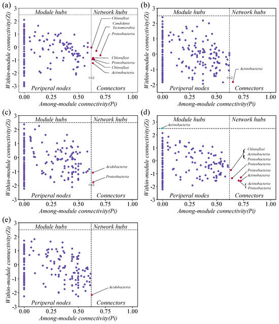 A Zi-Pi plot showing the distribution of OTUs based on their topological roles in the bacteria networks under CK (a), N1 (b), N2 (c), N3 (d) and N4 (e), respectively. The threshold values of Zi and Pi for categorizing the OTUs were 2.5 and 0.62, respectively.