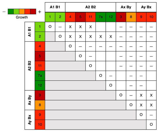 Mating trials for the first 12 isolates, with colors indicating pre-observed growth rates. Pairings were scored as self (O), mating compatible (X), not compatible (–), or not observed (blank).