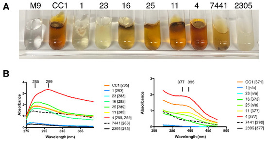 UV-Vis spectrum of isolates producing pigment in M9-glucoseCAM30 liquid minimal media. (A) The M9-glucose control and the parental CC1 are shown next to a gradation of pigment intensity (CC1-1, 23, 16, 25, 11, 4) and Omphalotus olearius (HHB 7441) and Omphalotus guepiniiformis (RHP 2305). (B) Representative scans of the pigmentation visible when growing in liquid. Absorption peaks are given in brackets.