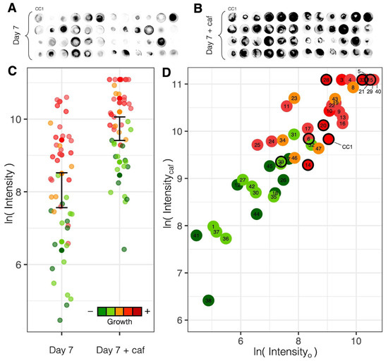 Bioluminescence across O. olivascens isolates. (A) The parental strain (CC1) and all 47 basidiospore-derived isolates, imaged collectively after 7 days of growth on BCY in two 24-well plates. (B) The same cultures imaged immediately after the addition of caffeic acid. (C) Difference in luminescence intensity (natural log-transformed) before and after treatment with caffeic acid, with 95% confidence intervals for the collective mean. (D) Enhancement in luminescence intensity (natural log-transformed) in each isolate after treatment with caffeic acid; black circles indicate isolates with clamp connections. Colors in C and D reflect pre-observed growth rate categories.