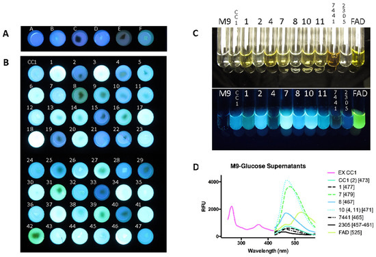 Fluorescence of fungal cultures. Cultures were transferred to 24-well plates with clear glass bottoms containing translucent M9-glucose agar and grown for 7 days. (Panel A) A, empty well; B, Pleurotus ostreatus; C, Armillaria mellea; D, Panellus stipticus; E, Omphalotus olearius; and F, Omphalotus guepiniiformis photographed with UV 365 nm transillumination; (Panel B) O. olivascens isolates CC1 (parental heterokaryon) and the spore-derived isolates 1–47 photographed with UV 365 nm transillumination. (Panel C) Representative culture supernatants (CC1, 1, 2, 4, 7a, 8, 10, 11) and Omphalotus olearius (7441), Omphalotus guepiniiformis (2305), and flavin adenine dinucleotide (FAD) in glass tubes photographed in light (top) and with UV 365 nm transillumination; the M9-glucose media was used as a control. (Panel D) The excitation spectrum of the CC1 supernatant and the emission spectra of the same representative cultures. A representative culture number given first, with the other cultures having the same peaks in parentheses, and the emission peaks given in brackets.