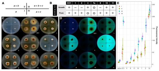 The RFUs for media of a given treatment varied widely across strains (Figure 9D,E), and differed as much as 60-fold between the most and least intense. The RFUs also differed significantly between treatments within all strains (one-way ANOVA, p < 0.001), except for CC1-4 and CC1-7a (p > 0.05). For the strains with significant fluorescence contrast, treatments with casamino acids (III and IV) showed greater intensity than treatments without casamino acids (I and II; Tukey’s test, p < 0.05). Notably, CC1-7a had greater RFU intensity in its treatments without casamino acids than all other isolates showed in treatments with casamino acids. CC1-4 was the only isolate to measure lower fluorescence intensity than the blank media.