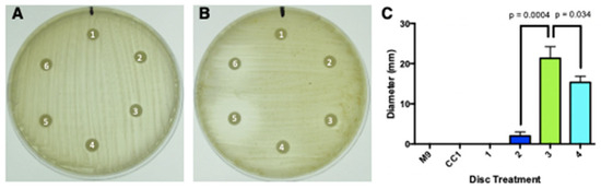 Disk diffusion assay of O. olivascens M9-glucose culture supernatants. (A) Staphylococcus aureus exposed to 1 (M9); 2 (CC1 heterokaryon); 3 (CC1-1); 4 (CC1-2), 5 (CC1-3), and 6 (CC1-4). (B) Mycobacterium smegmatis exposed to 1 (M9), 2 (CC1 heterokaryon), 3 (CC1-1), 4 (CC1-2), 5 (CC1-3), and 6 (CC1-4). (C) Graphical representation of the diameters measured for M. smegmatis.