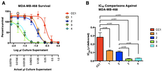 (A) Dose-response curves of Omphalotus isolate culture supernatants with error expressed as the standard error of the mean (SEM). Dose responses were determined as relative percent survival of MDA-MB-468 triple negative breast cancer cells following exposure to two-fold dilutions initiated from a 1:10 dilution of the respective Omphalotus cultures. (B) Comparison of the IC50 values and their significance.