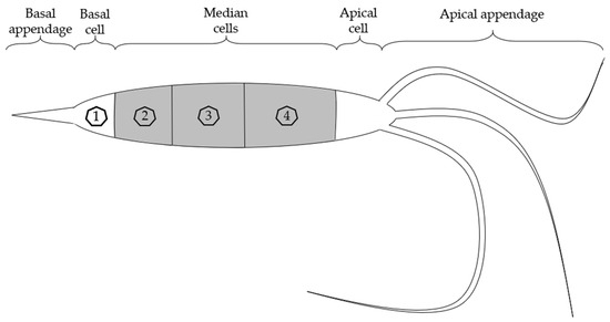 Schematic illustration of Neopestalotiopsis rosae conidia with individual cells. Numbers represent first to fourth cell from the base.
