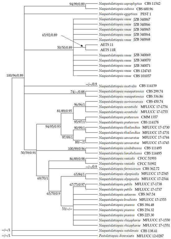 For phylogenetic analyses, sequences of ITS and TUB regions were chosen according to Maharachchikumbura et al. (2014), Norphanphoun et al. (2019), and Sun et al. (2021) (Appendix A, Table A1) [11,23,39]. Sequences were downloaded from the NCBI GenBank database. ITS and TUB sequences were condensed with BioEdit (version 5.0.9) and aligned using the ClustalW algorithm in the MEGA software (version 11) [40]. Alignments were edited with BioEdit (version 5.0.9) to remove incomplete and corrupted regions. Maximum likelihood (ML), maximum parsimony (MP), and Bayesian inference (BI) analyses were performed. Pestalotiopsis diversiseta (MFLUCC 12–0287) was used as the outgroup for the phylogenetic trees [23].