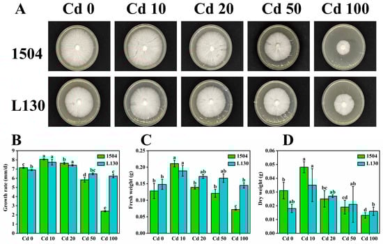 Effects of cadmium stress on mycelia growth. (A) Mycelial morphology; (B) growth rate; (C) fresh weight; (D) dry weight. Cd 0, Cd 10, Cd 20, and Cd 50 represent 0, 10, 20, 50, and 100 μM Cd, respectively. Values are presented as mean ± standard deviation (n = 3). Small letters indicate significant differences among the varieties and treatments (p < 0.05). Values in a column followed by different letters are significantly different (p < 0.05).