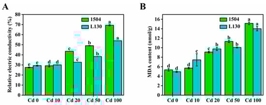 Effects of cadmium stress on cell membrane permeability and integrity. (A) Relative electric conductivity; (B) MDA content. Values in a column followed by different letters are significantly different (p < 0.05).