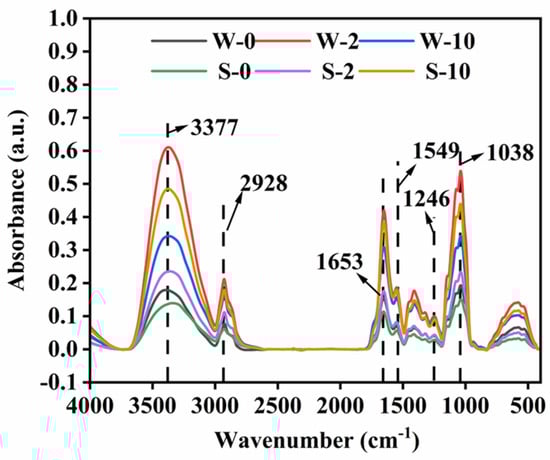FTIR spectra were used to evaluate alterations in the functional groups of cellular components under cadmium stress. As shown in Figure 4, the broad and strong peaks at 3389–3336 cm−1 were associated with the stretching vibrations of O-H and N-H [32,33]. The sharp peaks at 1655–1653, 1549–1546, and 1250–1244 cm−1 corresponded to amide I (stretching vibration of C=O), II (bending vibration of N-H), and III (stretching vibration of C-N) bands, respectively [10]. The peaks located at 2800–3100 cm−1 were due to the antisymmetric vibration of –CH in fatty acids, and the absorption peaks at 900–1200 cm−1 represented the characteristic absorptions for polysaccharides [20]. It was observed that the characteristic absorption peaks mentioned above were all enhanced to varying degrees in 1504 and L130 after cadmium treatment. The results suggest that the O-H group of polysaccharides, with a high affinity for divalent cations, might be involved in cadmium bonding. Cadmium stress might induce the dissociation of polymetric O-H groups, contributing to the cadmium tolerance of L. edodes mycelia [34]. The carboxylate groups and amino groups in proteins might interact with cadmium and form cadmium–protein complexes [10]. In addition, cadmium stress changed the lipid composition of the cell membrane. Thus, we inferred that cadmium stress induced interactions between functional groups and cadmium, resulting in structural alterations in macromolecular compounds, which ultimately disrupted normal metabolism in L. edodes mycelia [35].