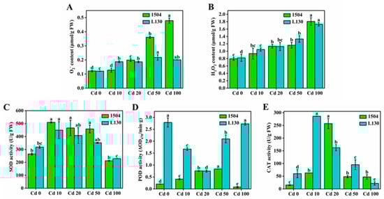 Effects of cadmium stress on the antioxidant system. (A) O2− content; (B) H2O2 content; (C) SOD activity; (D) POD activity; (E) CAT activity. Values in a column followed by different letters are significantly different (p < 0.05).