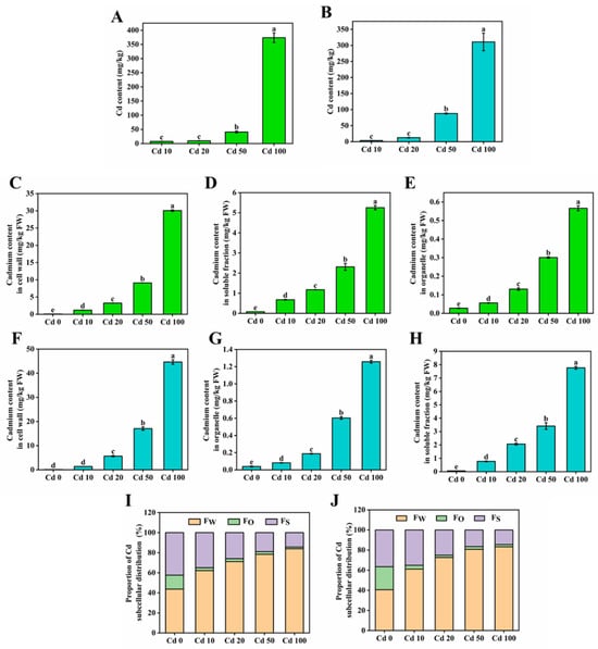 Cd accumulation and subcellular distribution. (A,B) Cd content in L. edodes 1504 (A) and L130 (B); (C–E) the Cd content of cell wall (C), organelle (D), and soluble fractions (E) in 1504; (F–H) the Cd content of cell wall (C), organelle (D), and soluble fractions (E) in L130; (I,J) the proportions of Cd in different subcellular fractions in 1504 (I) and L130 (J). FW, Cd content in the cell wall; FO, Cd content in organelles; FS, Cd content in the soluble fraction. Values in a column followed by different letters are significantly different (p < 0.05).
