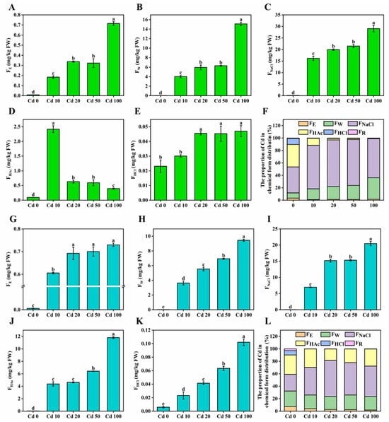 Cd chemical forms. (A–E) The content of Cd in 80% ethanol- (A), H2O- (B), NaCl- (C), Hac- (D), and HCl-extractable (E) states in 1504; (F) the proportions of different chemical forms in 1504; (G–K) the content of Cd in 80% ethanol- (G), H2O- (H), NaCl- (I), Hac- (J), and HCl-extractable (K) states in L130; (L) the proportions of different chemical forms in L130. FE, inorganic species extracted by 80% ethanol; FW, water-soluble species extracted by deionized water; FNaCl, pectate and protein-integrated species extracted by 1 M NaCl; FHAc, phosphate-bound species extracted by 2% acetic acid; FHCl, oxalate-bound species extracted by 0.6 M HCl; FR, Cd in residues. Values in a column followed by different letters are significantly different (p < 0.05).