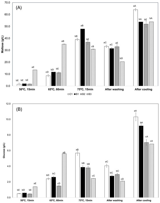 Maltose (A) and glucose (B) changes on wort during beer brewing added with WB. In the white column—control; in the black column—BB1; in the gray column—BB2; and in the white column with dots—BB3. Through analysis of variance, followed by Tukey’s HSD test, a, b, c, different lowercase letters, indicate statistical differences among treatments in the same brewing process at 5% of significance. A, B, C, D, E, different capital letters, indicate statistical differences among brewing process in the same treatment at 5% of significance.