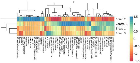 Heatmap representing the VOCs’ profile of the different beer samples (control, BB1, BB2, and BB3).