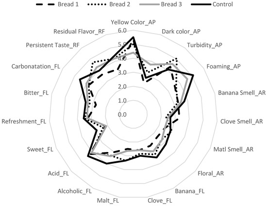 The sensory profiles of the investigated beers are shown in Figure 3. For appearance attributes, the highest dark color (p < 0.05) was observed in bread beer with a total substitution of wheat flakes for wasted bread (BB3), whereas the other samples did not differ between them (p > 0.05). Regarding foam formation, the control and BB3 samples did not show a significant difference and presented the highest intensity (p < 0.05), while beers with a partial substitution of wheat flakes did not significantly differ between them. Considering the aroma attributes, the banana smell had higher scores in the control and BB3 beers (p < 0.05); meanwhile, BB1 and BB2 did not differ; for the clove, malt, and floral aroma, all samples did not differ in terms of their intensities (p > 0.05).