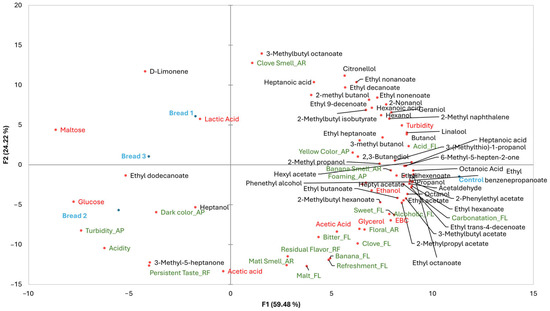 It is shown that wasted bread beers are clustered together, and they were separated, on F1, from the control beer. The MFA also evidenced that D-limonene, ethyl dodecanoate, and heptanol might represent volatile markers of the presence of wasted bread in the beer samples, as well as the turbidity, acidity, dark color, and persistent taste. Instead, ale beers without bread residues were mostly marked by a banana aroma, sweet flavor, and a wide range of VOCs, indicating a greater bouquet of flavors/aroma.