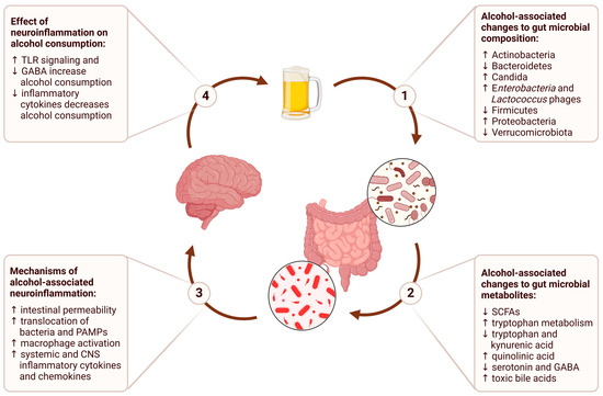 In this review, we will examine each stage of this process, from the impact of alcohol consumption on the gut microbiome to the downstream effects on brain function and behavior (Figure 1). We will conclude with a discussion of the therapeutic implications of the gut–brain axis and potential future directions for research on alcohol use disorder.