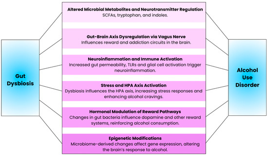 Illustration of the key mechanisms underlying the connection between gut dysbiosis and alcohol use disorder.