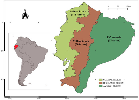 In Ecuador, the agricultural sector contributes to the gross national product by 8% [22], and 5.7 million liters of milk are produced daily at the national level, providing employment for 1,140,000 Ecuadorians [23]. According to the national cadaster, Ecuador has 4,525,183 cattle originating from 285,579 farms, with around 41% of the animals in the Coastal region, 49% in the Highlands, and the remainder in Eastern region [24].