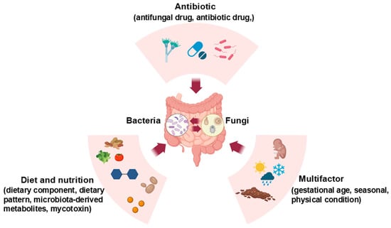 The interaction between the gut mycobiome and bacteriome is an act of balance, influenced by various factors such as different life stages, nutrients, and drug use (Figure 1) [150,151,152]. In pigs, the early colonization and composition of fungi can be greatly impacted by diet (e.g., dietary component and pattern), nutrition [56], and antibiotic administration [67]. It has also been found that some intestinal diseases, such as diarrhea, can significantly impact the structure of the intestinal microbiota in piglets [153].