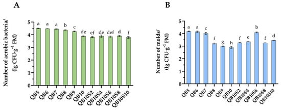 The number of aerobic bacteria (A) and molds (B) in mixed silage (Test 1). The different lowercase letters (a–h) above the column indicate significant differences among treatments (p < 0.05).