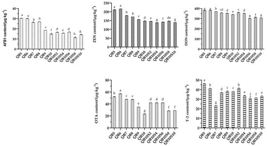Changes in five mycotoxins’ content in two types of quinoa mixed silage (Test 1). The different lowercase letters (a–h) above the column indicate significant differences among treatments (p < 0.05).