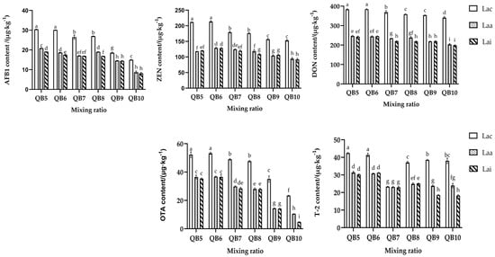 Effect of additives on mycotoxins in mixed silage of WPQ and WPC (Test 2). The different lowercase letters (a–i) above the column indicate significant differences among treatments (p < 0.05).