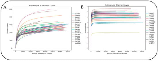 (A) Multi-sample rarefaction curves. (B) Multi-sample shannon curves (Test 2).