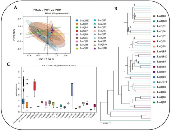The statistical analysis results of the alpha diversity index are shown in Table 11. The Shannon index showed that the bacterial community diversity in the Lac, Laa and Lai groups was not significantly increased with the increasing proportion of WPQ in mixed silage (p > 0.05). Under the same mixing ratio, the bacterial diversity of the Laa group and the Lai group with the mixing ratio of QB7, QB8 and QB9 was higher than that of the Lac group, but the difference between the Laa group and the Lai group was not significant. The regularity of the Simpson index variation is not obvious, and the bacterial diversity of samples cannot be accurately analyzed. As can be seen from the Chao1 index and the ACE index, with the increase in quinoa-addition ratio, the species richness of the Lac group is generally declining, while that of the Laa and Lai groups is generally increasing. When the mixing ratio is QB9 and QB10, the addition of Laa and Lai can increase the species richness of the Lac group.