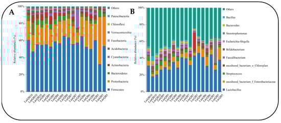 The phylum level mainly includes Firmicutes, Proteobacteria, Bacteroidetes, Actinobacteria, and Cyanobacteria. Among them, the relative abundance of Firmicutes was the highest among the treatment groups (32.20%~65.30%), followed by Proteobacteria (12.08~55.37%) (Figure 6A). At the same time, it can be seen from the figure that after adding Mix (Lai group) to silage with different mixing ratios, the relative abundance of Firmicutes increased, compared with that of Lac groups, while the effect of adding Max on the relative abundance of Firmicutes was not significant. In the non-additive treatment groups (Lac), increasing the proportion of quinoa resulted in an overall upward trend in the relative abundance of Firmicutes, reaching the highest (65.30%) at LacQB8. On the contrary, the relative abundance of Proteobacteria decreases with the increase in quinoa ratio. In addition, the relative abundance of Bacteroidetes and Actinobacteria in each treatment group was 3.56–14.49% and 1.51–9.22%, respectively, and the addition of Max and Mix had no significant effect on the relative abundance of the two.