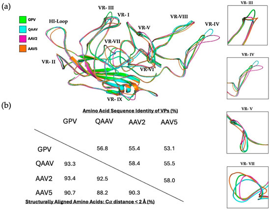 Sequence and structural comparisons of GPV (green), QAAV (turquoise), AAV2 (pink), and AAV5 (orange) monomers. (a) Alignment of the monomers of GPV, QAAV, AAV2, and AAV5. VRs containing significant structural variation between the monomers are boxed (right). (b) Table depicting the VP amino acid sequence and structural identities of GPV, QAAV, AAV2, and AAV5.