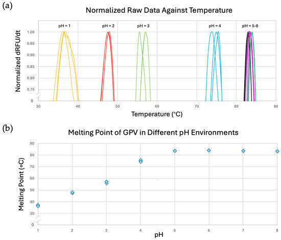 DSF data characterizing the thermal stability of the GPV capsid in different pH environments. (a) Raw fluorescence data curves from DSF of the VLPs of GPV at pHs of 1–8. Each color represents a discrete pH value. (b) Scatterplot of the measured melting points of the VLPs of GPV against pH. The experiments were conducted in triplicate.