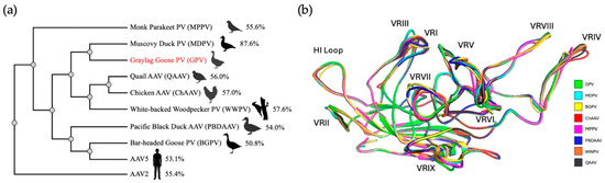 Comparisons of the VP amino acid sequences and structures of different bird-based dependoparvoviruses as well as AAV2 and AAV5. (a) Phylogenetic analysis of the VP amino acid sequences. Sequence identities compared to GPV are given for all viruses as a percentage. (b) Structural alignment of the predicted AlphaFold2.3 models of seven bird-based dependoparvoviruses with the cryo-EM GPV model. All the VRs, as well as the HI loop, are labeled.