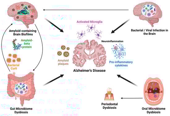 This review aims to: (i) explore unconventional perspectives and emerging paradigms regarding microbial involvement in AD pathogenesis, shedding light on intricate microbe–host interactions that may facilitate neurodegeneration (Figure 1); (ii) examine how diverse microbial agents (e.g., bacteria and viruses) and microbial populations (e.g., oral, gut, and brain microbiomes), along with their interactions with the host, contribute to AD pathogenesis and how this understanding can inform future therapeutic strategies; and (iii) discuss future research directions and potential therapeutic strategies, such as microbiome-based therapies, that could benefit from these insights. By looking beyond current approaches and investigating the roles of diverse microbial communities, we can gain a more comprehensive understanding of the underlying drivers of AD pathogenesis.