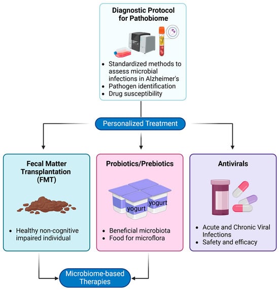 Emerging evidence has begun to highlight the significant role of microbial entities in the pathogenesis of AD, propelling a paradigm shift towards exploration of microbial interactions and their effects on neurodegeneration. Notably, a recent study demonstrated that fecal microbiota transplantation (FMT) from AD patients to germ-free or microbiota-depleted mice impaired hippocampal neurogenesis and cognitive performance []. Additionally, emerging evidence highlights the potential role of viral exposures in increasing the risk of NDs. For instance, a comprehensive study identified significant associations between 45 viral exposures and an elevated risk of NDs including AD, with some risks persisting for up to 15 years post-infection []. These findings suggest that a diverse pool of microbial agents may contribute to neurodegenerative processes, highlighting the importance of investigating their roles in AD pathogenesis and the mechanisms by which they exert these pathogenic effects.