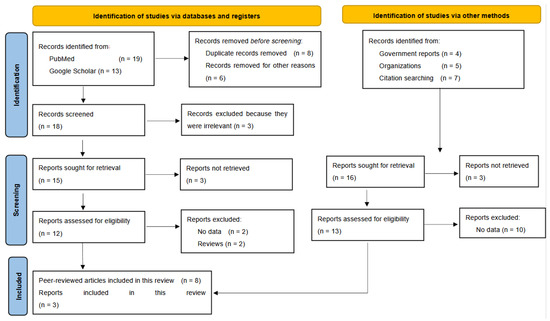 Our systematic data search and mining for peer-reviewed articles and gray literature that included relevant information about RVF in Rwanda initially identified 32 peer-reviewed articles and 4 Government reports (Figure 1). Additionally, five reports were identified in international organizations’ databases, alongside seven reports that were retrieved from citations (Figure 1). These reports included eight peer-reviewed articles and three gray literature reports (Figure 1). However, only eight articles and three reports met the eligibility criteria for inclusion in this review, as they included information about the emergence, epidemiology, geographical distribution, host range, and genomic characterization of the RVFV, as well as prevention and response measures for RVF outbreaks in the country (Figure 1) [3,29,30,31,34,35,36,37,38,39,40].