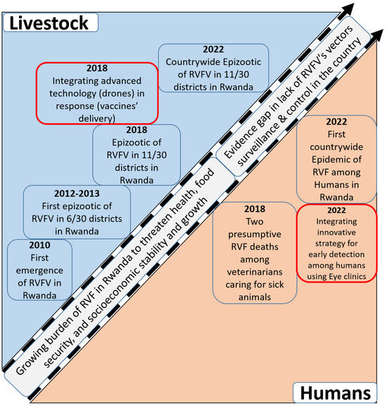 Illustration of the development of the Rift Valley fever burden in Rwanda; aspects related to the integration of innovative strategies for early detection and response to outbreaks are highlighted in red boxes, and gaps in evidence and policymaking are presented in the diagonal boxes.