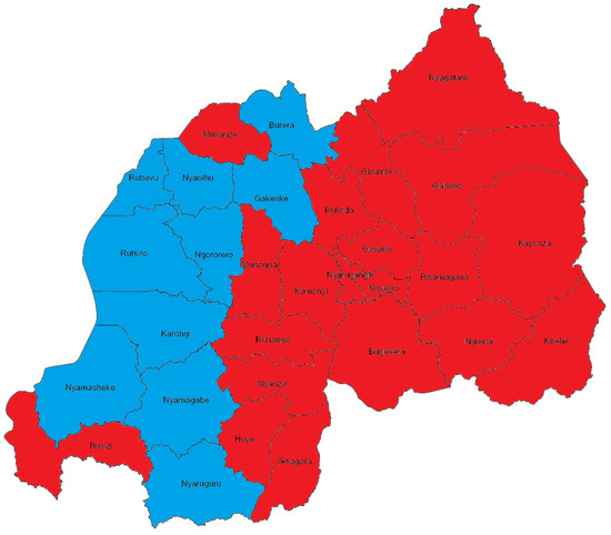 Map of Rwanda showing the distribution of RVF infections among human and livestock populations in districts highlighted in red. Meanwhile, districts that only reported infections among livestock without the involvement of humans are highlighted in blue.
