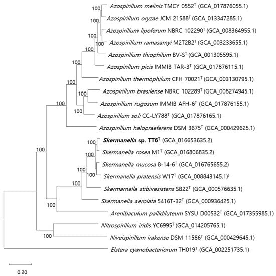 Whole genome-based phylogenomic analysis, based on alignments of 431 coding gene sequences from 20 closely related type strains, revealed a phylogenetic pattern that was similar to that observed in the 16S rRNA gene-based tree (Figure 1). Strain TT6T clustered with S. rosea M1T, and separately with S. mucosa 8-14-6T and S. pratensis W17T, forming a distinct group on the same branch. The distance between the latter two species is similar to that between the species in the first cluster. These four strains, sharing a close lineage, were distantly related to S. stibiiresistens SB22T and S. aerolata 5416T-32T. The genera Skermanella and Arenibaculum form a distinct clade that clusters with members of the genus Azospirillum, which are known for their nitrogen-fixing capabilities. This clade is further related to another clade comprising genera such as Nitrospirillum and Niveispirillum, all of which belong to the family Azospirillaceae. The positions of the genera Deserticella and Desertibacter, which have been proposed as closely related to the genus Skermanella [28], could not be determined in the phylogenomic tree, due the lack of available genome information for these genera.