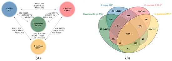 Relationship among Skermanella strains. (A) Based on orthoANIu, dDDH, and AAI values; (B) Venn diagram showing shared and unique orthologous gene clusters. The number of singletons specific to each genome is presented in parentheses.