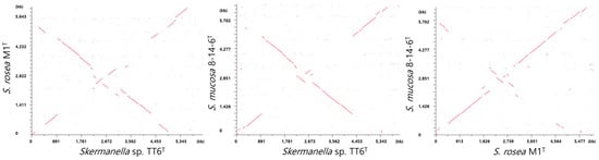 The total DNA from strains TT6T, S. rosea M1T, and S. mucosa 8-14-6T was extracted and purified using the phenol–chloroform extraction and ethanol precipitation method. DNA quality and quantity were assessed using UV absorbance scanning (Nanodrop spectrophotometer, Scinco Co., Seoul, Republic of Korea) and fluorescence measurements (Qubit 4 fluorometer, Thermo Fisher, Waltham, MA, USA) [20]. The whole genome of strain TT6T was sequenced using the PacBio RSII sequencing platform with 20 kb libraries and the Illumina NovaSeq6000 sequencing platform, with 151 paired-end reads of PCR-free 550 bp libraries (TruSeq DNA PCR-free), at DNAlink Co., Seoul, Republic of Korea. The genomes of S. rosea M1T and S. mucosa 8-14-6T were also sequenced, using both short-read NovaSeq6000 technology at DNAlink and the long-read MinION platform (Oxford Nanopore Technology, Oxford, UK). For Nanopore sequencing, libraries were prepared using the SQK-LSK109 kit and multiplexed using the EXP-NBD104 barcoding kit, following the manufacturer’s protocols. Sequencing was performed on a MinION sequencer (v20.10.3) using an R9.4.1-flow cell [20]. Reads were base-called and demultiplexed using Guppy v4.2.2 in high accuracy mode, and filtered for quality (minimum Q-score = 7) before conversion to FASTQ format. The sequencing platforms yielded 7.76 Gb, 7.05 Gb, and 6.27 Gb of clean data from strains TT6T, S. rosea M1T, and S. mucosa 8-14-6T, respectively. Long and short reads were de novo assembled using Unicycler v0.4.9b [21], and the quality of the assembled genome sequences was evaluated with CheckM v1.1.3 software [22]. The raw sequencing data and assembled genome sequences were deposited in GenBank, and annotation of the genome sequences was performed using the NCBI Prokaryotic Genome Annotation Pipeline (PGAP, www.ncbi.nlm.nih.gov/genome/annotation_prok/) [23], applying the best-placed reference protein set, GeneMarkS-2+ (ver 5.1). These depositions and anotations were processed between 4 January 2021 and 9 November 2021.