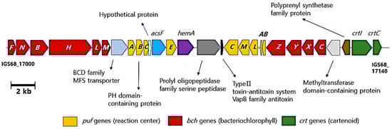 In addition, a series of genes responsible for producing trehalose from UDP-glucose or starch were also identified in the genomes. Trehalose, composed of two glucose molecules, is known for its ability to prevent freezing and dehydration of cells due to its high water retention properties [39]. The genomes of these strains also contained genes involved in the biosynthesis of red carotenoids, such as spirilloxanthin and tetrahydrospirilloxanthin, which are synthesized through the unusual spirilloxanthin pathway involving lycopene and rhodopin intermediates [40]. Additionally, genes for the biosynthesis of yellow carotenoids, including 3,4-dihydrospheroidene, spheroidene, and hydroxyspheroidene, were identified as being synthesized via the spheroidene pathway through neurosporene [41]. Carotenoids play a protective role by shielding cells from radicals, oxidants, and UV radiation, and they also serve as accessory pigments in light-harvesting complexes to capture solar energy [42].