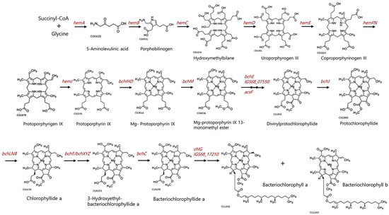 A biosynthetic pathway for bacteriochlorophylls in strain TT6T. This pathway is inferred from genes encoding enzymes that catalyze each step of the established bacteriochlorophyll biosynthesis pathway. The molecular structures are adapted from KEGG.