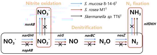 Genes and metabolic pathways involved in inorganic nitrogen metabolism in Skermanella strains, illustrating key processes such as denitrification, nitrite oxidation, and nitrogen fixation. Reaction steps are represented by arrows.